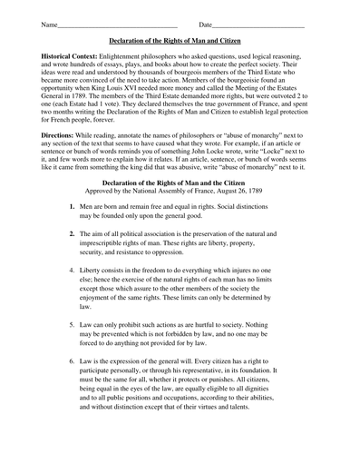 Find declaration of the rights of man and citizen lesson plans and teaching resources. Some of the worksheets for this concept are Dec of Lesson one the declaration of independence The bronx high school of science The rights of women student work What are human rights lesson i teachers guide Universal declaration of human rights The. The Declaration of the Rights of Man and Citizen Student Worksheet.